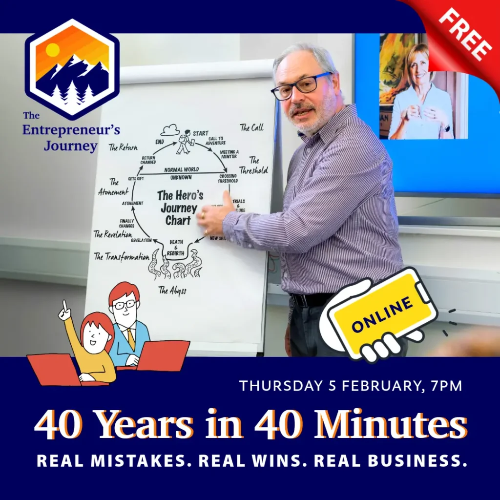 This FREE webinar provides a speedy snapshot of 40 years of an actual Entrepreneur’s Journey, through frightening failures and superb successes! With real life stories, Jan and Justin show that with relentless focus, the right tools and the confidence to reach out, possibilities will materialise, and success awaits.