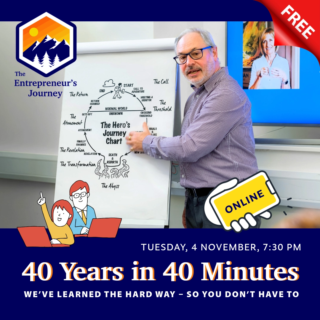 This webinar provides a snapshot of 40 years of an actual Entrepreneur’s Journey, through frightening failures and superb successes! With real life stories, Jan and Justin show that with focus, the right tools and confidence, possibilities abound, and success awaits.